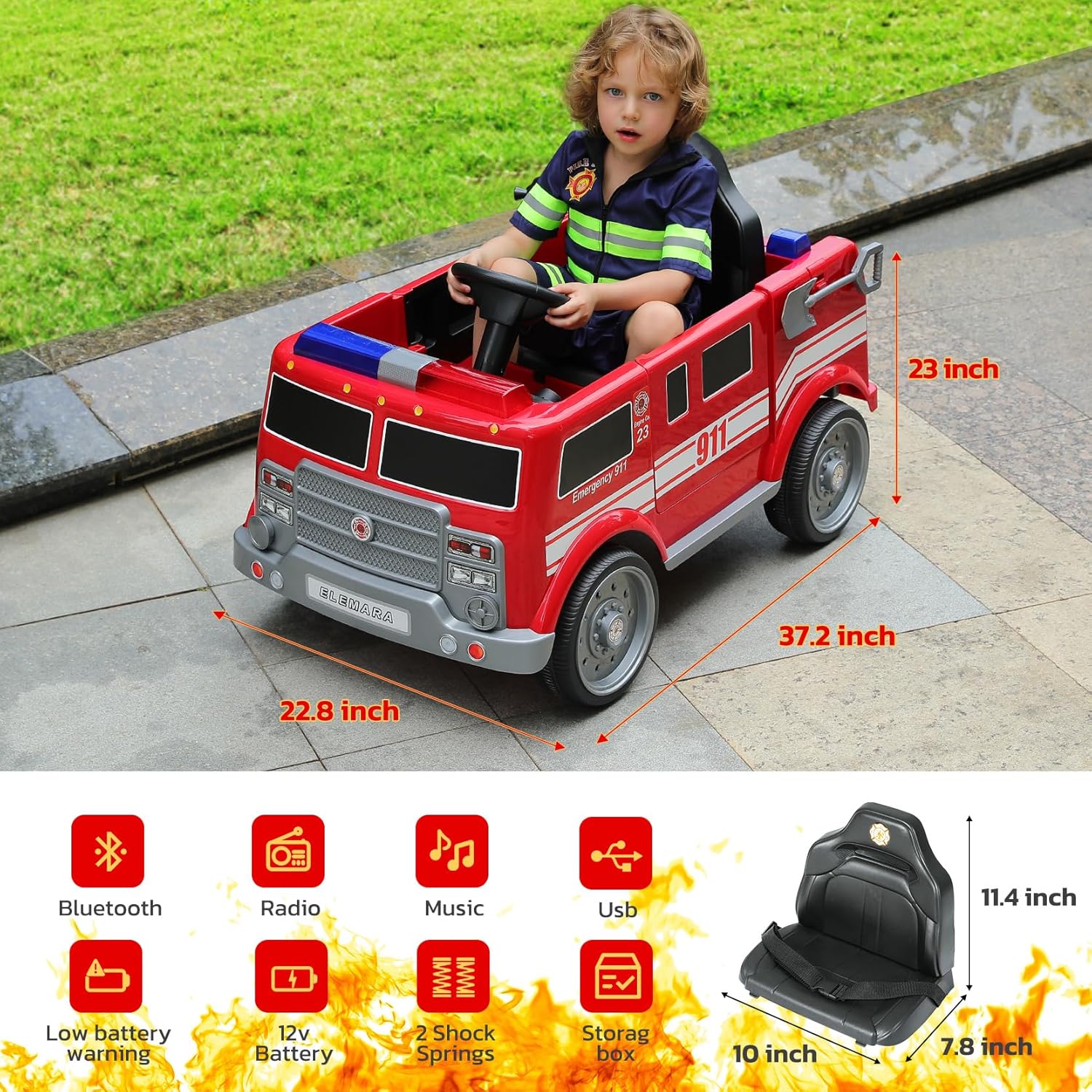 - Fire Extinguisher & Storage Function:The fire truck ride on toy comes with a fire extinguisher, press to spray water, realistic firefighter experience, huge back storage box to easily hold toys, Part of the accessories are placed here, open to take out it