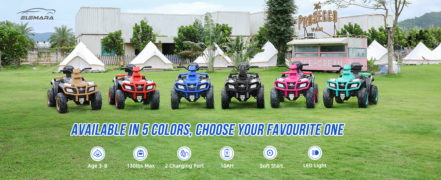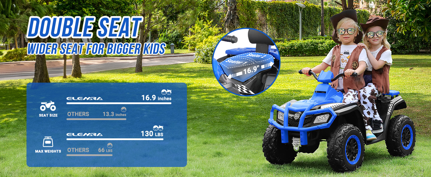 - 2 Seater Design ATV for Kids:ELEMARA electric vehicle with 2 seater extended seat, the entire seat length is 16.5 inches and the max capacity is 130 lbs. It can accommodate 2 kids to play at the same time. Kids can play with friends or siblings