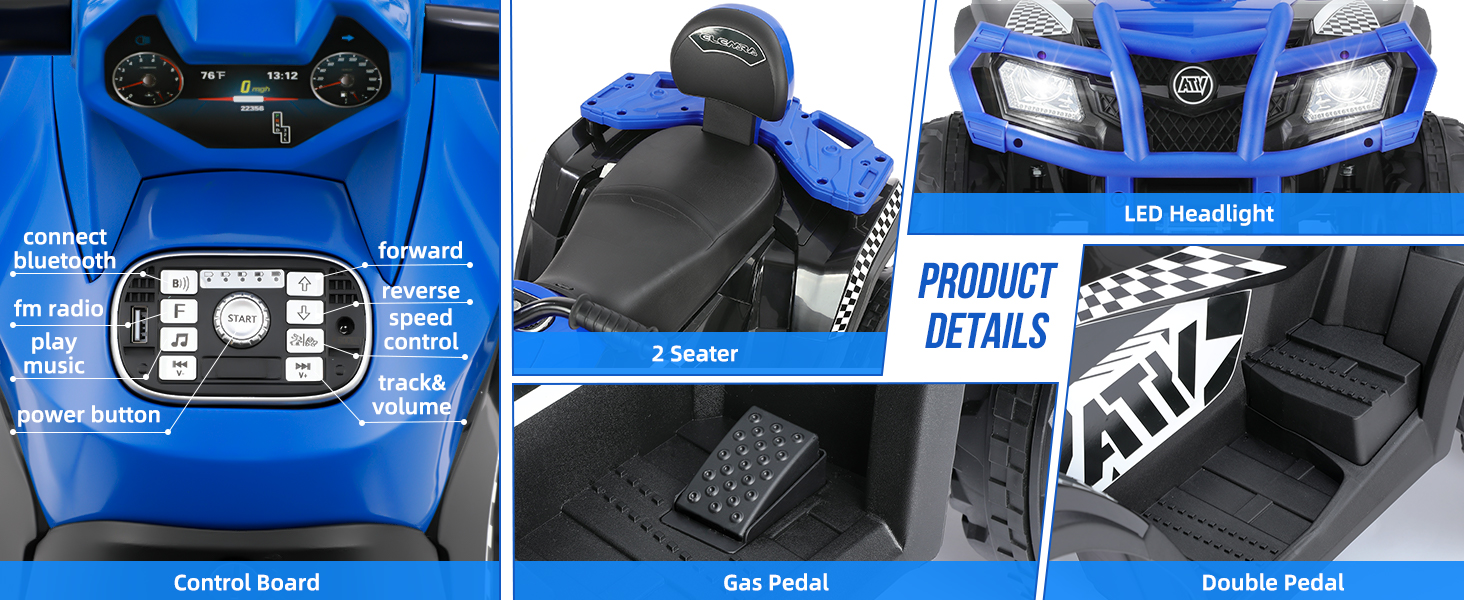 - Fun Function:Features with Bright LED headlights,gas pedal accelerator,forward and reverse function, USB, music, speed and volume adjustment,power display,and one button key start. Kids can change to various modes.It's an ideal gift for your kids