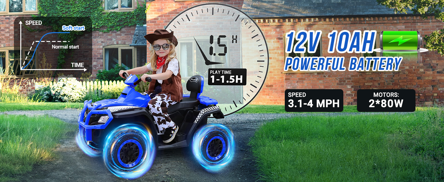 - Powerful Performance:This kids electric four wheeler features 2 x 85 W large motors and 10 AH battery. it has 2 speeds,low speed of 3.1 MPH and high speed of 4 MPH. It will automatically remind you that you need to charge when the battery is running out