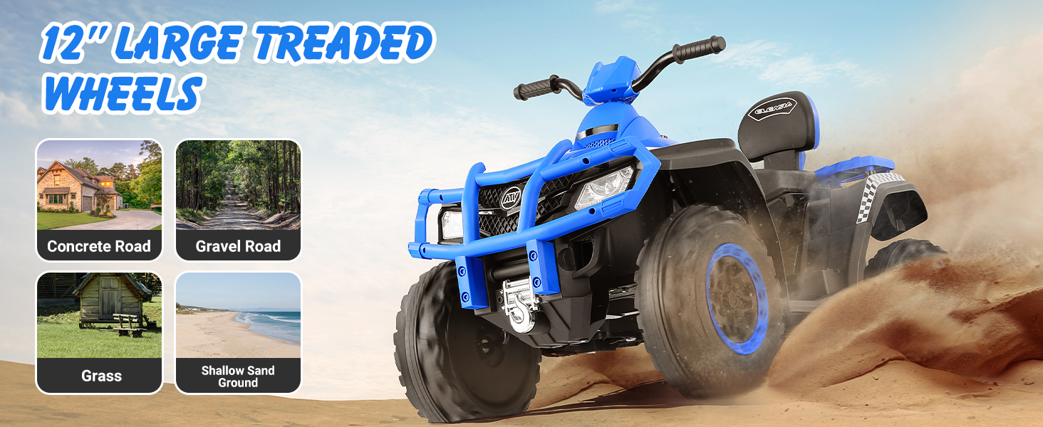 - Suitable for a Lot of Surfaces:Toddler ATV has 4 large treaded wheels,2 shock absorbing springs on the front wheels of the ATV greatly reduces the bumpiness of the car,It's suitable for hardened surface,wooden boards,asphalt floors,shallow sand and grass