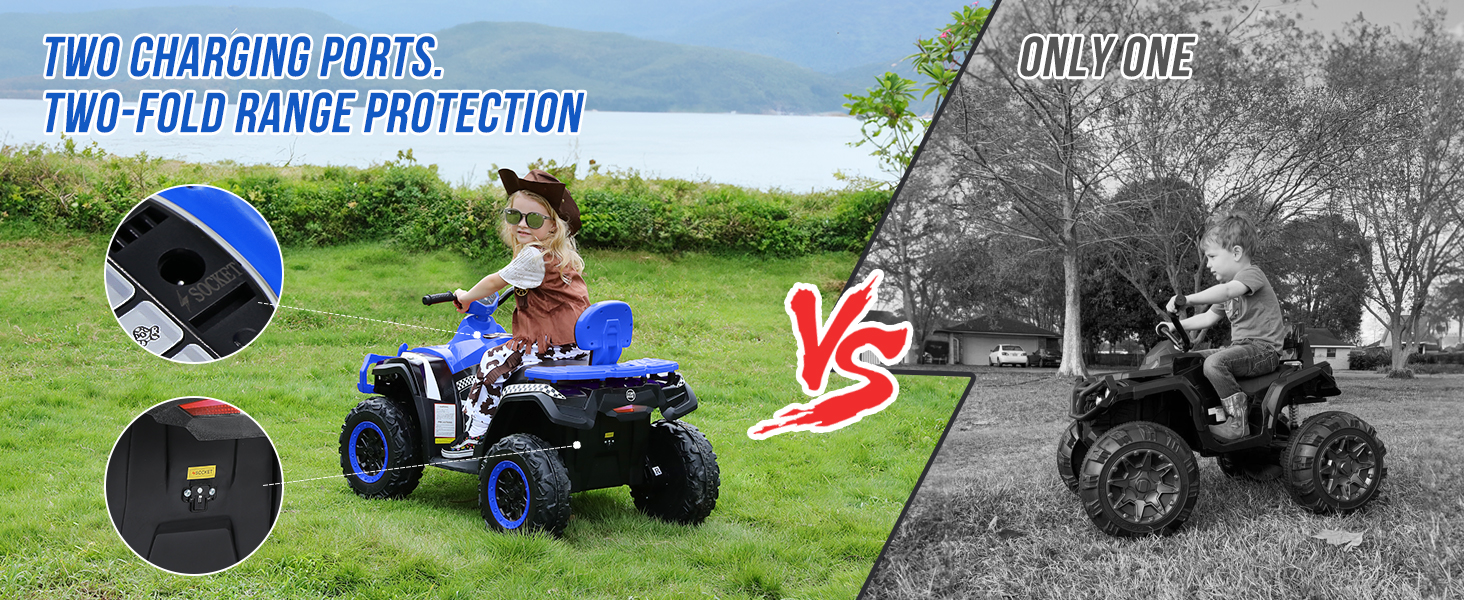 - 2 Ways for Charging:The 12 V kids 4 wheeler is equipped with 2 charging ports, you can charge through the charging port on the center console. There is a spare charging port at the rear of the car as well, which makes charging more convenient